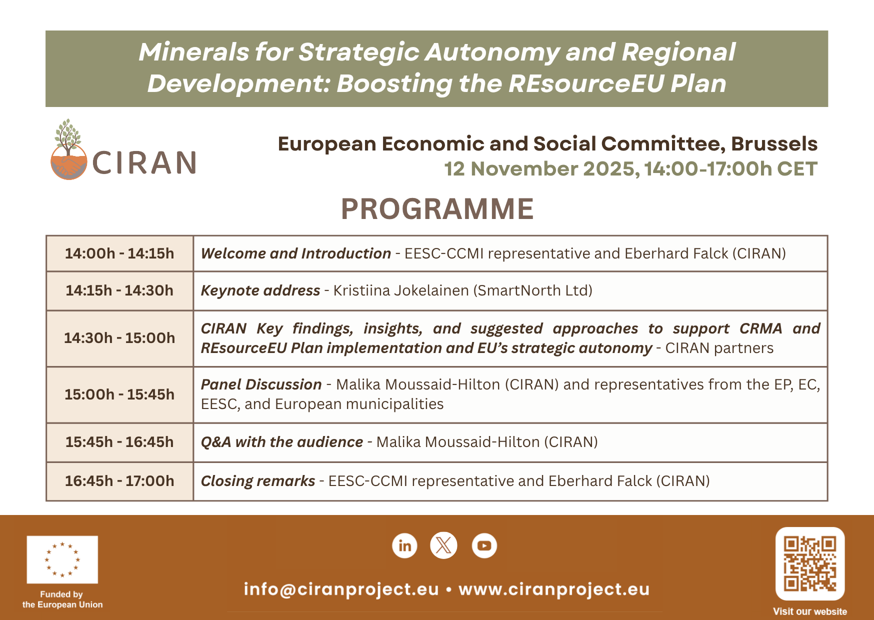 The focus of this dedicated stakeholder dialogue at the European Economic and Social Committee (EESC/CCMI) was to discuss how Europe can secure Critical Raw Materials while respecting environmental protection and democratic participation. The event brought together EU institutions, regional and local policymakers, industry and trade union representatives, environmental NGOs, geoscience experts, and CIRAN Consortium partners.